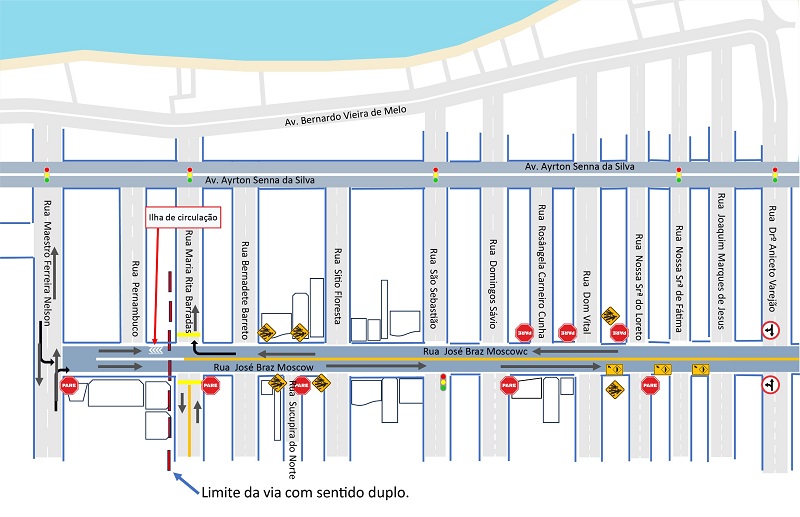 “Para contribuir mais ainda com a nova circulação dos carros, haverá proibição de estacionamento em alguns trechos da José Braz Moscow. Além disso, a rua Pernambuco passa a ser mão única, no sentido leste/oeste”, explicou.